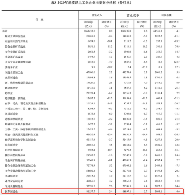 据中国汽车工业协会公布数据显示,2020年,我国规模以上工业企业营业收入达到106.14万亿元,同比增长0.8%。其中,汽车制造业营业收入达到8.156万亿元,同比增长3.4%,占到总体工业企业营收的7.68%,在近40个工业行业中位列第二。